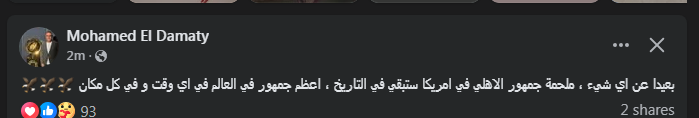 تحيا مصر، وكتب محمد الدماطي عبر حسابه الرسمي" فيس بوك":"بعيداً عن أي شيء ملحمة جمهور الأهلي في امريكا ستبقي في التاريخ أعظم جمهور في العالم في أي وقت و في كل مكان".