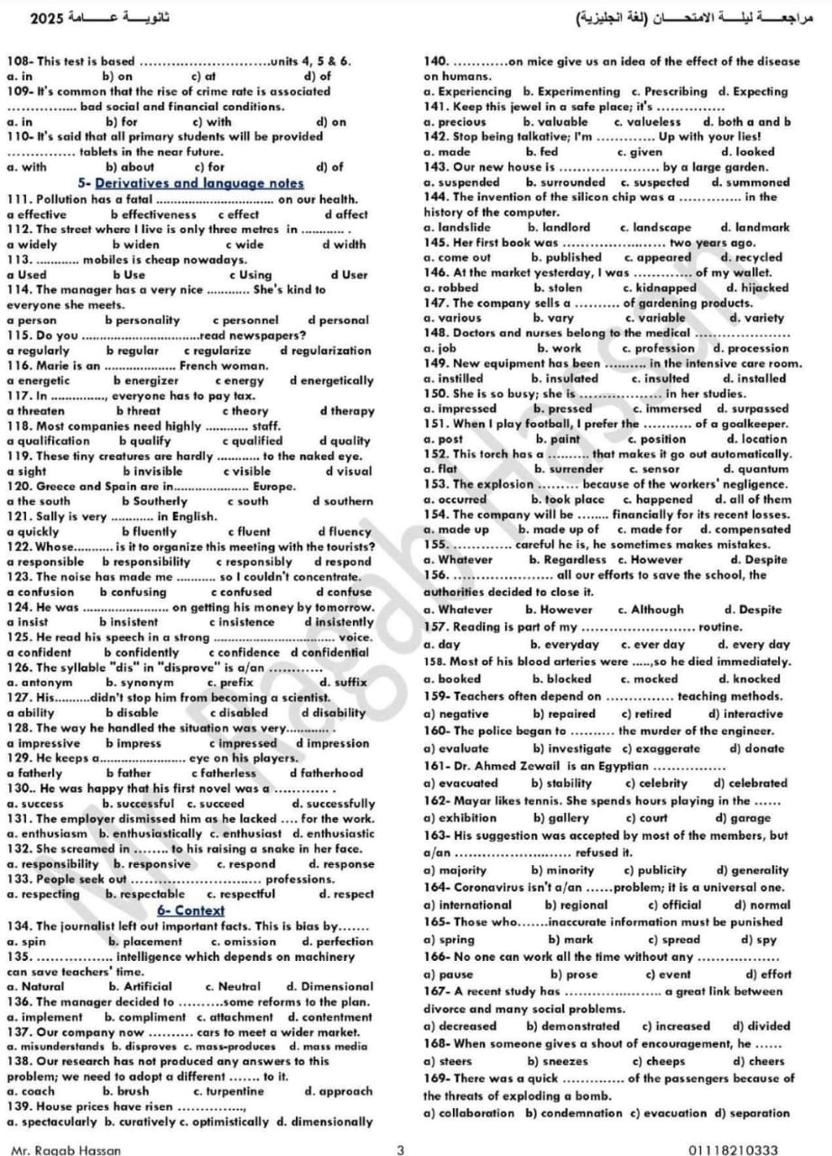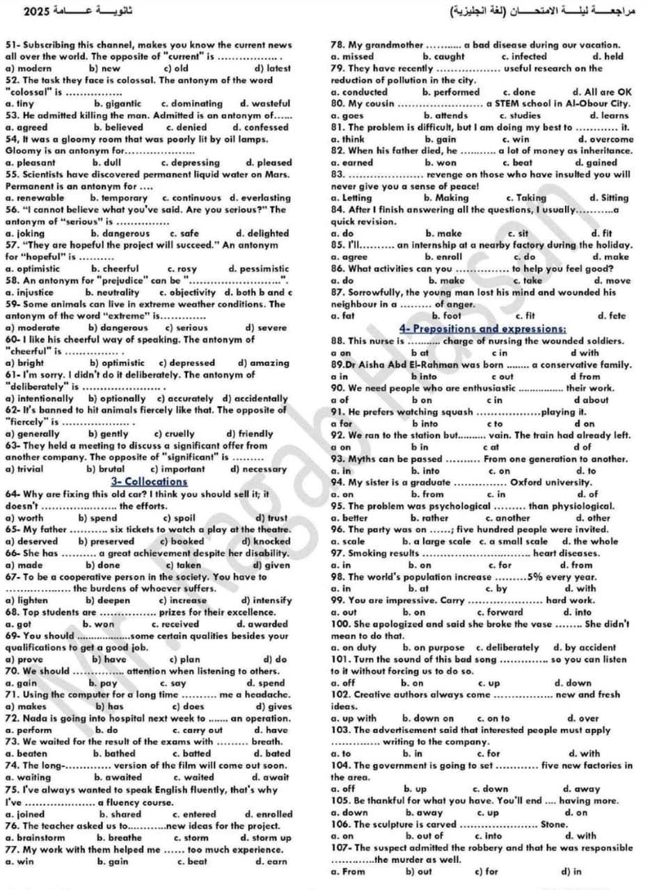 وتأتي مراجعة ليلة الامتحان فى اللغة الإنجليزية للثانوية العامة 2025 كما يلي: