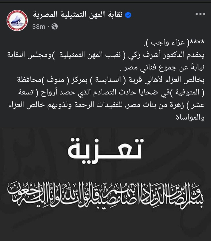 نشرت الصفحة الرسمية لـ نقابة المهن التمثيلية برئاسة الدكتور أشرف زكي منشور عبر موقع التواصل الاجتماعي فيسبوك وجهت من خلاله النعي لفقيدات حادث الطريق الإقليمي بالمنوفية، وجاءت الكلمات مؤثرة تحاول من خلالها مساندة الأهالي في تلك الأزمة الصعبة، وجاء المنشور الذي رصده موقع تحيا مصر كالتالي: "عزاء واجب.. يتقدم الدكتور أشرف زكي نقيب المهن التمثيلية ومجلس النقابة نيابةً عن جموع فناني مصر بخالص العزاء لأهالي قرية السنابسة بمركز منوف محافظة المنوفية في ضحايا حادث التصادم الذي حصد أرواح تسعة عشر زهرة من بنات مصر، للفقيدات الرحمة ولذويهم خالص العزاء والمواساة".