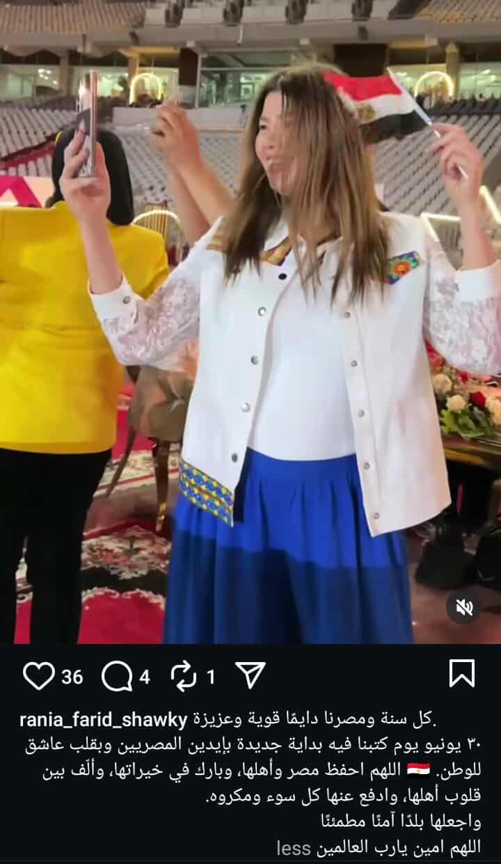 ونشرت رانيا فريد شوقي فيديو لها عبر حسابها الرسمي بموقع تبادل الصور والفيديوهات انستجرام وهي ممسكة بعلم مصر وعلقت عليه وفقا لما رصده موقع تحيا مصر، قائلة: كل سنة ومصرنا دايمًا قوية وعزيزة... ٣٠ يونيو يوم كتبنا فيه بداية جديدة بإيدين المصريين وبقلب عاشق للوطن.. اللهم احفظ مصر وأهلها، وبارك في خيراتها، وألّف بين قلوب أهلها، وادفع عنها كل سوء ومكروه واجعلها بلدًا آمنًا مطمئنًا.. اللهم امين يارب العالمين.