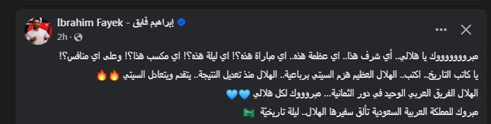 وتابع قائلاً:" يا كاتب التاريخ اكتب الهلال العظيم هزم السيتي برباعية الهلال منذ تعديل النتيجة يتقدم ويتعادل السيتي".