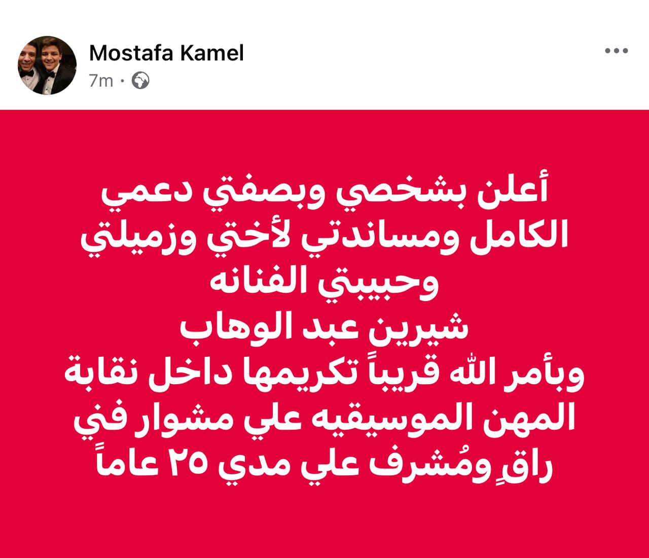 وفي بيان رسمي رصده موقع تحيا مصر عبر حساباته المختلف، قال مصطفى كامل: "أعلن، بشخصي وبصفتي، دعمي الكامل ومساندتي لأختي وزميلتي وحبيبتي الفنانة شيرين عبد الوهاب، وبأمر الله قريباً سيتم تكريمها داخل نقابة المهن الموسيقية، تقديراً لمشوارها الفني الراقي والمُشرف."