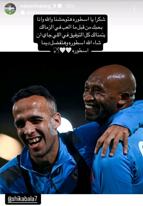 وكتب ناصر منسي في رسالته عبر ستوري إنستجرام، شكراً يا أسطورة هتوحشنا والله وأنا بحبك من قبل ما ألعب في الزمالك.