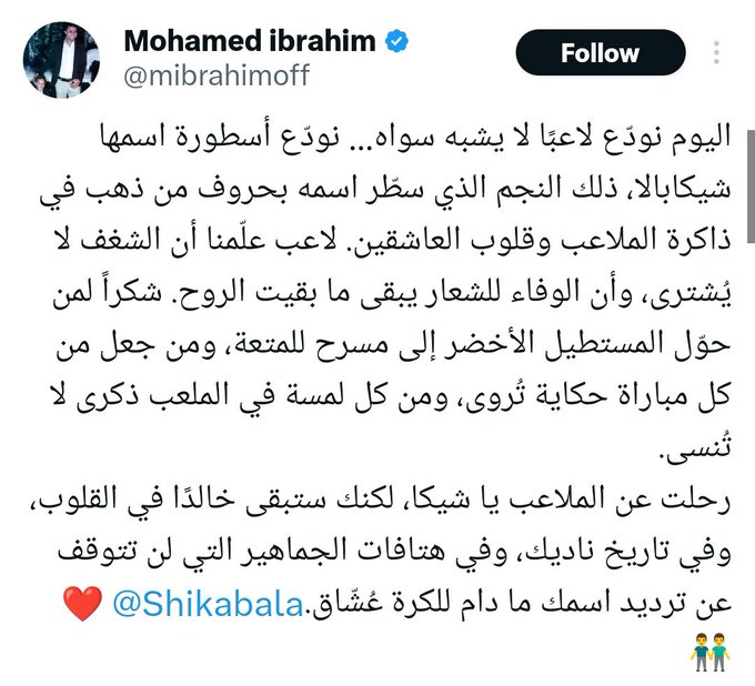 وكتب محمد إبراهيم في رسالته عبر إكس، اليوم نودع لاعبًا لا يشبه سواه، نودع أسطورة اسمها شيكابالا، ذلك النجم الذي سطر اسمه بحروف من ذهب في ذاكرة الملاعب وقلوب العاشقين لاعب علّمنا أن الشغف لا يُشترى، وأن الوفاء للشعار يبقى ما بقيت الروح.