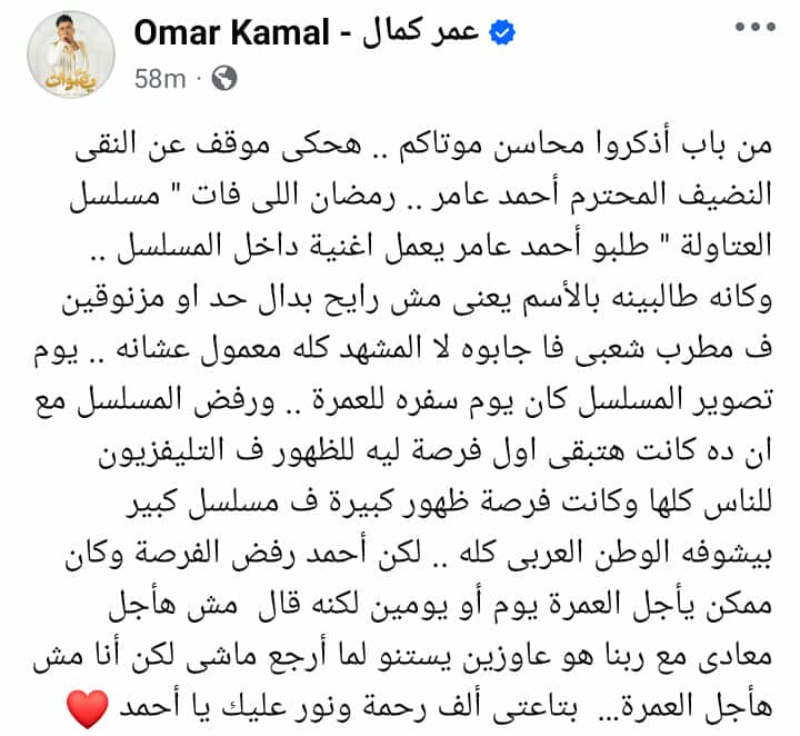 وكتب عمر كمال في منشور رصده موقع تحيا مصر عبر حسابه الرسمي بموقع التواصل الاجتماعي فيسبوك: من باب أذكروا محاسن موتاكم .. هحكى موقف عن النقى النضيف المحترم أحمد عامر .. رمضان اللى فات " مسلسل العتاولة " طلبو أحمد عامر يعمل اغنية داخل المسلسل .. وكانه طالبينه بالأسم يعنى مش رايح بدال حد او مزنوقين ف مطرب شعبى فا جابوه لا المشهد كله معمول عشانه .. يوم تصوير المسلسل كان يوم سفره للعمرة.
