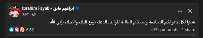 الإعلامي إبراهيم فايق: شكراً لكل دعواتكم الصادقة ومحبتكم الغالية للوالد