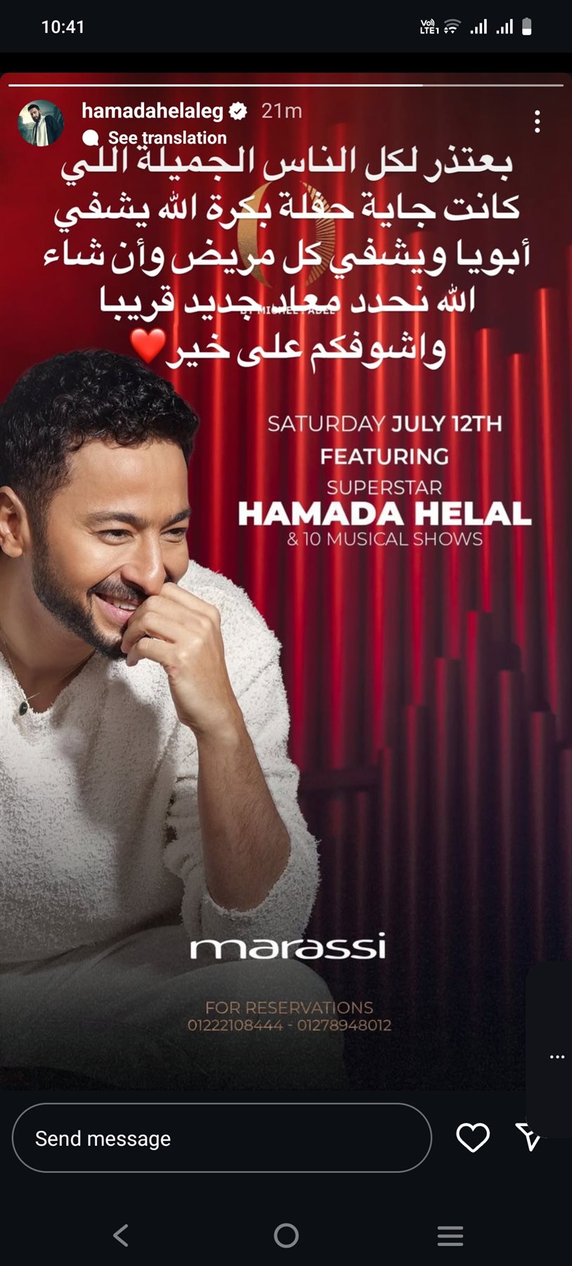 كشف الفنان حمادة هلال عن تأجيل حفله في مراسي، حيث خرج عن صمته ليعلن تأجيل الحفل برسالة مؤثرة عبر حساباته الرسمية، أعلن فيها تعرض والده لوعكة صحية واعتذر لجمهوره عن تأجيل الحفل لأجل غير مسمى، وقال وفقًا لما يرصد موقع تحيا مصر: "بعتذر لكل الناس الجميلة اللي كانت جاية حفلة بكره.. الله يشفي أبويا ويشفي كل مريض، وإن شاء الله نحدد ميعاد جديد قريب وأشوفكم على خير"، وكان من المنتظر أن يشهد الحفل حضورًا جماهيريًا كثيفًا من محبي الفنان الذين عبّروا عن شغفهم الكبير بمتابعة عرضه المنتظر، خصوصًا بعد الإعلان عنه منذ أيام والترويج له بشكل واسع عبر منصات التواصل الاجتماعي، وقد لاقت رسالة هلال تفاعلًا واسعًا من جمهوره، حيث انهالت عليه التعليقات الداعمة والدعوات لوالده بالشفاء العاجل، مؤكدين تفهمهم الكامل للقرار ومتمنين له ولعائلته السلامة والصحة.