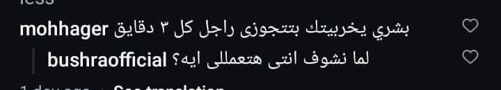 وقالت المتابعة لـ بشرى في تعليق رصده موقع تحيا مصر عبر حسابها الرسمي بموقع تبادل الصور والفيديوهات انستجرام على إحدى المنشورات "يخربيتك انتي بتتجوزي راجل كل 3 دقائق"، لترد عليها بشرى قائلة: "أما نشوفك انتي هتعملي اي".