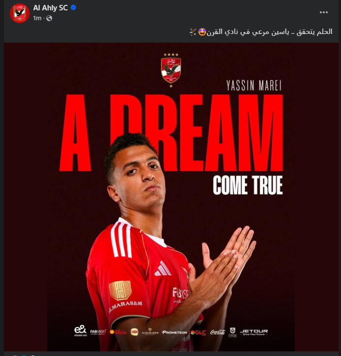 ونشرت الصفحة الرسمية للنادي الأهلي صورة لياسين مرعي، تحت تعليق:" الحلم يتحقق .. ياسين مرعي في نادي القرن".