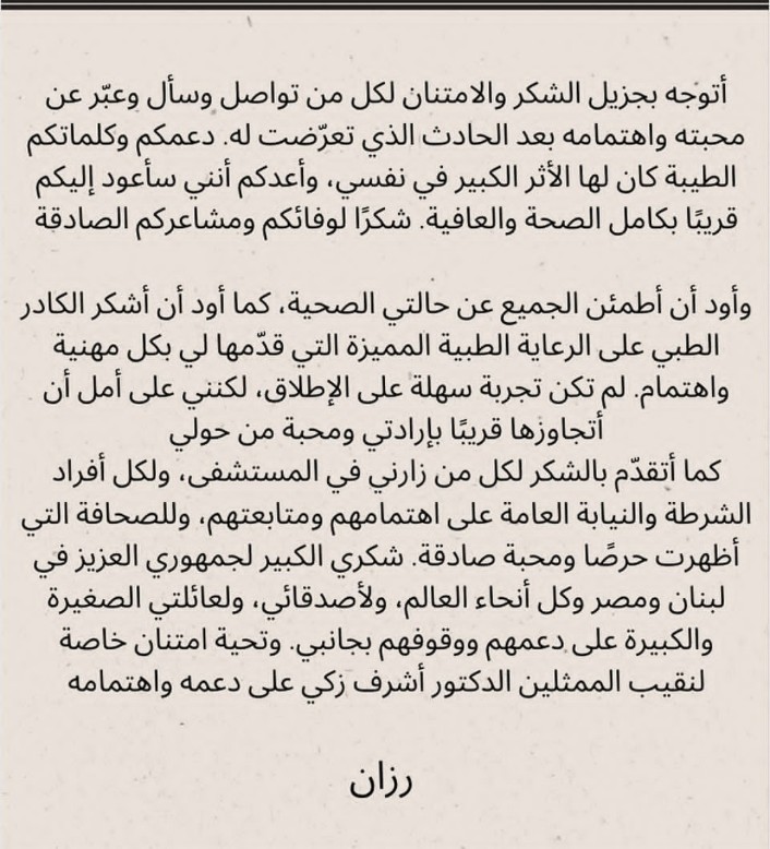 شكرت الفنانة رزان مغربي كل من حرص على الاطمئنان عليها وحاول التواصل معها بعد الحادث الخطير الذي تعرضت له، و في بيان رسمي أصدرته بعد استقرار حالتها حيث كانت نُقلت إلى المستشفى إثر حادث أليم وخضعت لعملية جراحية، وقالت رزان مغربي: "أتوجه بجزيل الشكر والامتنان لكل من تواصل وسأل وعبّر عن محبته واهتمامه بعد الحادث الذي تعرّضت له دعمكم وكلماتكم الطيبة كان لها الأثر الكبير في نفسي، وأعدكم أنني سأعود إليكم قريبًا بكامل الصحة والعافية. شكرًا لوفائكم ومشاعركم الصادقة".