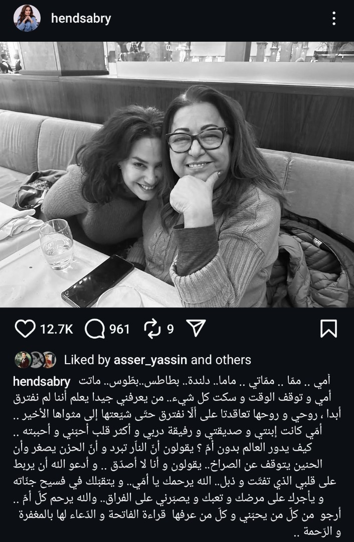 وطلبت هند صبري من محبيها الدعاء لوالدتها بالرحمة، قائلة: "أرجو من كل من يحبني، وكل من عرفها، قراءة الفاتحة والدعاء لها بالمغفرة والرحمة."