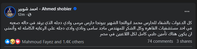 تحيا مصر، وكتب أحمد شوبير عبر حسابه الرسمي" فيس بوك": كل الدعوات بالشفاء للحارس محمد ابوالنجا الشهير ببونجا حارس مرمى وادي دجلة الذي يرقد في حاله صعبة في احد مستشفيات القاهرة، وكل الشكر للمهندس ماجد سامى ونادي وادى دجله علي الرعايه الكاملة له وأتمني ان يكون هناك تأمين طبي كامل لكل اللاعبين في مصر".