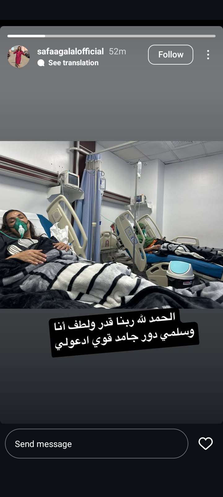 ونشرت الفنانة صفاء جلال صورة لها على حسابها الرسمي بموقع تبادل الصور والفيديوهات انستجرام في منشور رصده موقع تحيا مصر عبر خاصية ستوري: "الحمدلله ربنا قدر ولطف.. أنا وسلمى الحمدلله دور جامد أوي ادعولي"، وتفاعل عدد كبير من الجمهور مع منشور صفاء جلال بالدعاء لها بالشفاء العاجل.
