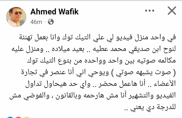 وقال أحمد وفيق في منشور رصده موقع تحيا مصر على حسابه الرسمي بموقع التواصل الاجتماعي فيسبوك: في واحد منزل فيديو لي علي التيك توك وانا بعمل تهنئة لنوح ابن صديقي محمد عطيه .. بعيد ميلاده .. ومنزل عليه مكالمه صوتيه بين واحد وواحده من بتوع التيك توك ( صوت يشبهه صوتي ) ويوحي اني أنا عنصر في تجارة الأعضاء .. أنا هاعمل محضر .. واي حد هيحاول تداول الفيديو والتشهير أنا مش هارحمه وبالقانون ، والفوضي مش للدرجة دي يعني .