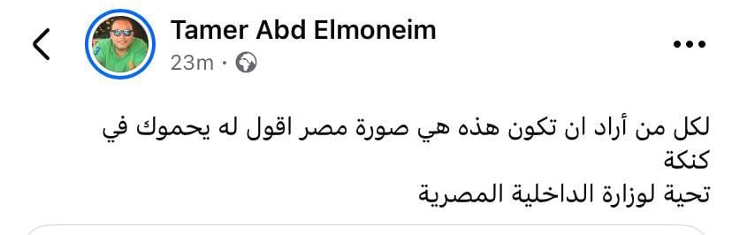وكتب الفنان تامر عبد المنعم منشورا عبر صفحته الرسمية على موقع التواصل الإجتماعي فيسبوك ورصده موقع تحيا مصر، قال فيها: لكل من أراد أن تكون هذه هي صورة مصر أقول له يحموك في كنكة.