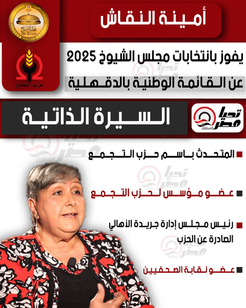 وينشر موقع تحيا مصر السيرة الذاتية لـ أمينة النقاش: أمينة النقاش هي صحفية بارزة وعضو مؤسس في حزب التجمع، وتشغل منصب المتحدث باسم الحزب. كما تترأس مجلس إدارة جريدة الأهالي، لسان حال الحزب. وهي أيضًا عضو بنقابة الصحفيين المصرية، وتعد من أبرز الأصوات المدافعة عن القضايا الوطنية والاجتماعية من خلال مقالاتها وكتاباتها.