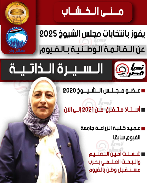 وينشر موقع تحيا مصر السيرة الذاتية للدكتورة منى الخشاب، عضو مجلس الشيوخ منذ عام 2020، والتي شغلت سابقًا منصب أمين التعليم والبحث العلمي بحزب مستقبل وطن في محافظة الفيوم، كما تولّت عمادة كلية الزراعة بجامعة الفيوم، وهي أستاذ متفرغ بالكلية منذ عام 2021 وحتى الآن.