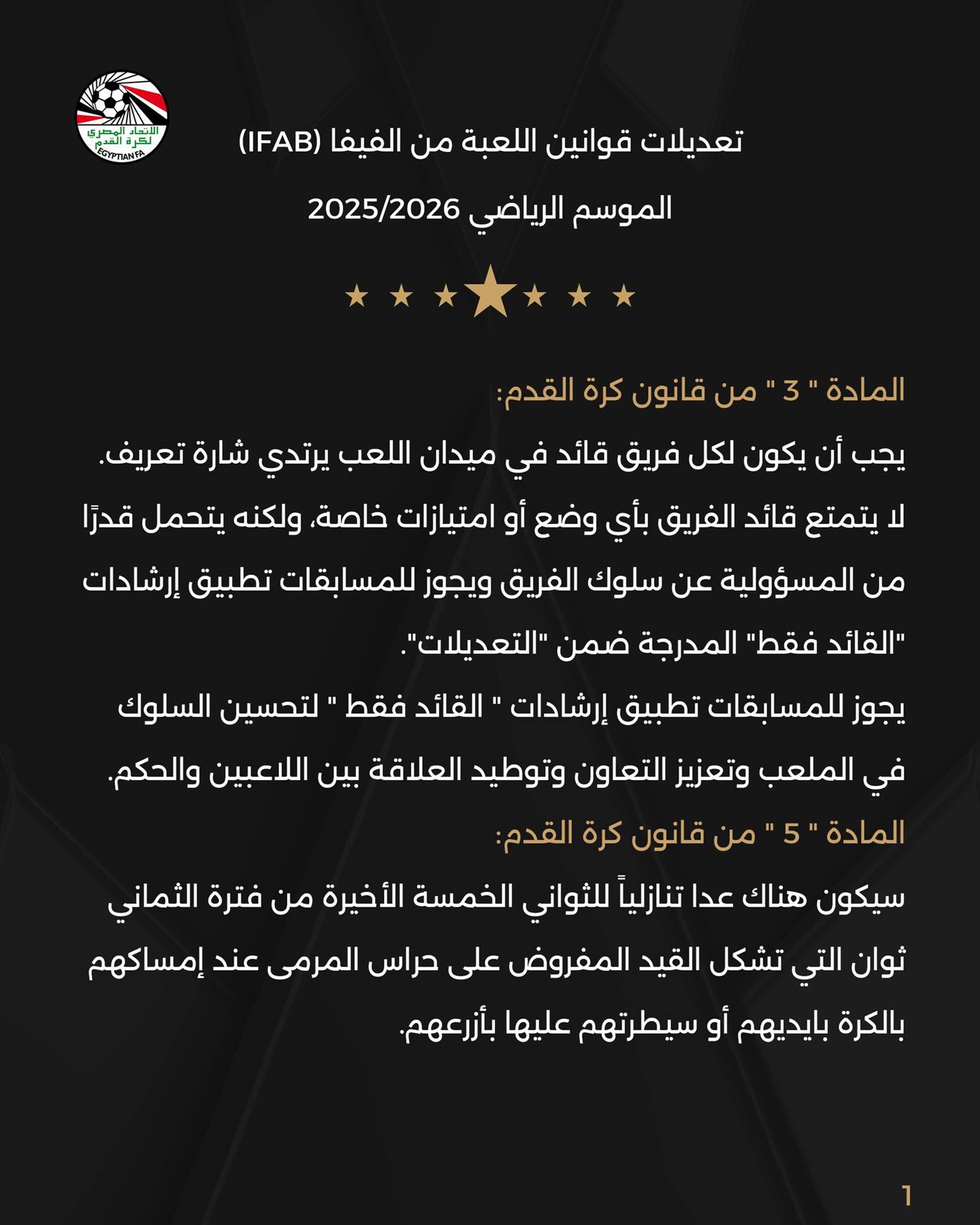 في إطار الالتزام بالتحديثات الصادرة عن مجلس الاتحاد الدولي لكرة القدم (IFAB) ، يُعلن الاتحاد المصري لكرة القدم عن بدء تطبيق تعديلات قانون كرة القدم لموسم 2025/2026 اعتبارًا من الجولة الأولى في جميع مسابقات الدوري المصري، ويستعرض تحيا مصر التفاصيل.