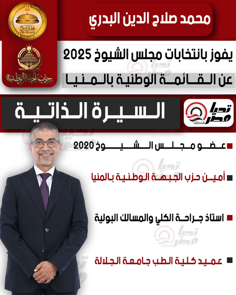 فاز الدكتور محمد صلاح الدين البدري في انتخابات مجلس الشيوخ 2025 عن القائمة الوطنية "من أجل مصر" بمحافظة المنيا، بعد حصول القائمة على أكثر من 5% من أصوات الناخبين المقيدين، وفقًا لنص القانون المنظم للعملية الانتخابية في هذه الدوائر.