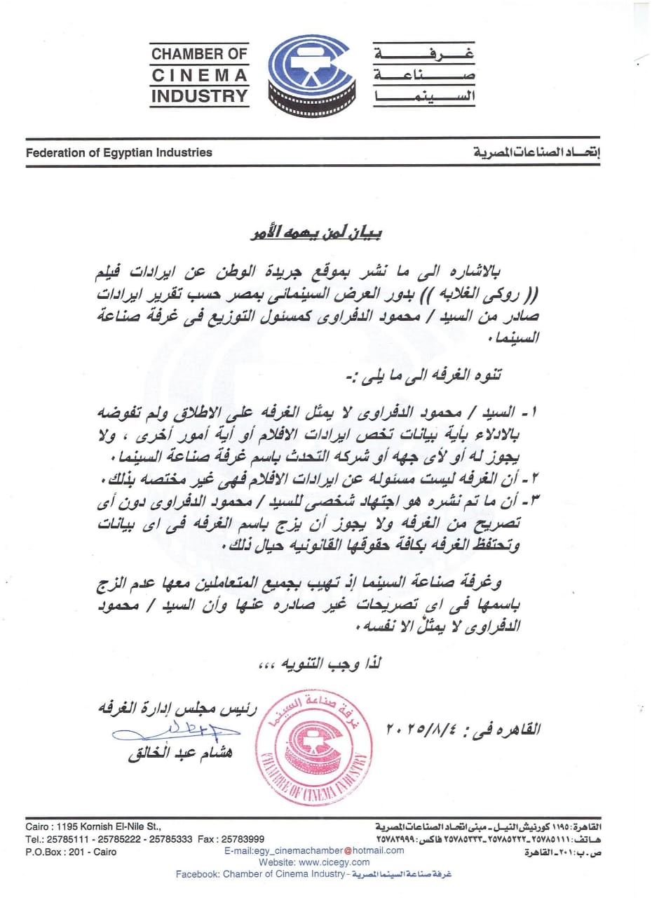 واختتمت مؤكدة: "ما تم نشره هو اجتهاد شخصي للسيد محمود الدفراوى دون أي تصريح من الغرفه ولا يجوز أن يزج بإسم الغرفة في اي بيانات وتحتفظ الغرفه بكافة حقوقها القانونية حيال ذلك، وغرفة صناعة السينما إذ تهيب بجميع المتعاملين معها عدم الزج باسمها في اى تصريحات غير صادره عنها وأن السيد محمود الدفراوى لا يمثل الا نفسه".