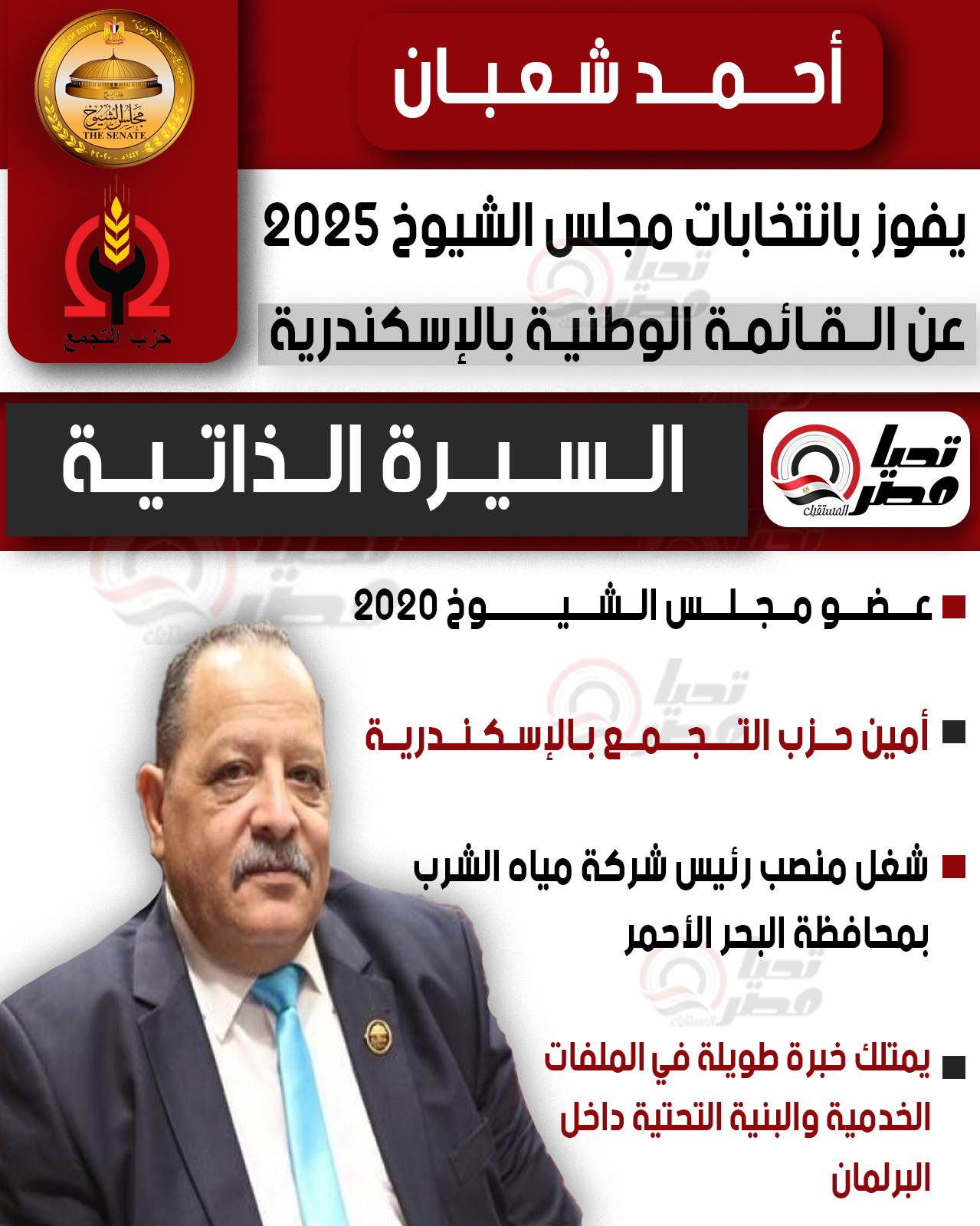 وفيما يلي، ينشر موقع تحيا مصر السيرة الذاتية للنائب أحمد شعبان عضو مجلس الشيوخ 2025: