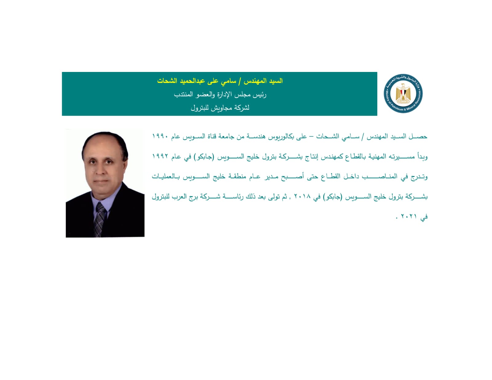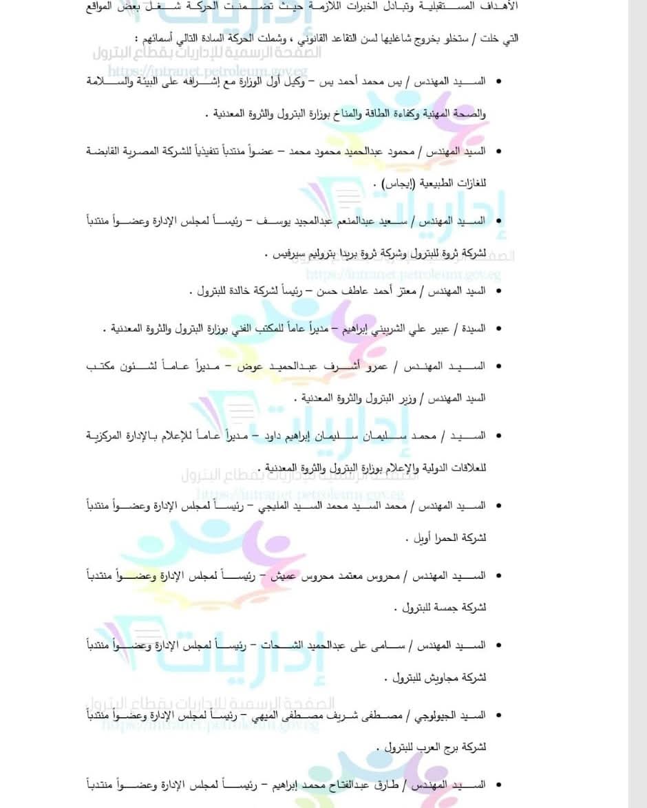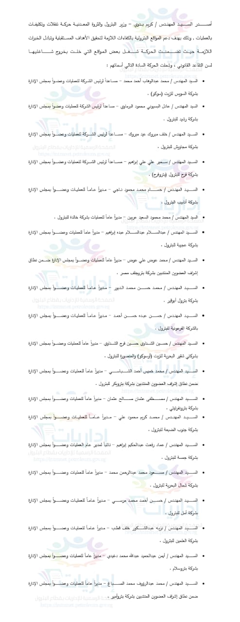 وشملت التغييرات أيضًا تعيين محمد سليمان داود مديرًا عامًا للإعلام بقطاع العلاقات الدولية، والمهندس محمد المليجي رئيسًا لمجلس إدارة "الحمرا أويل"، والمهندس محروس عميش لشركة جمسة للبترول، والمهندس سامي الشحات لرئاسة شركة مجاويش للبترول.