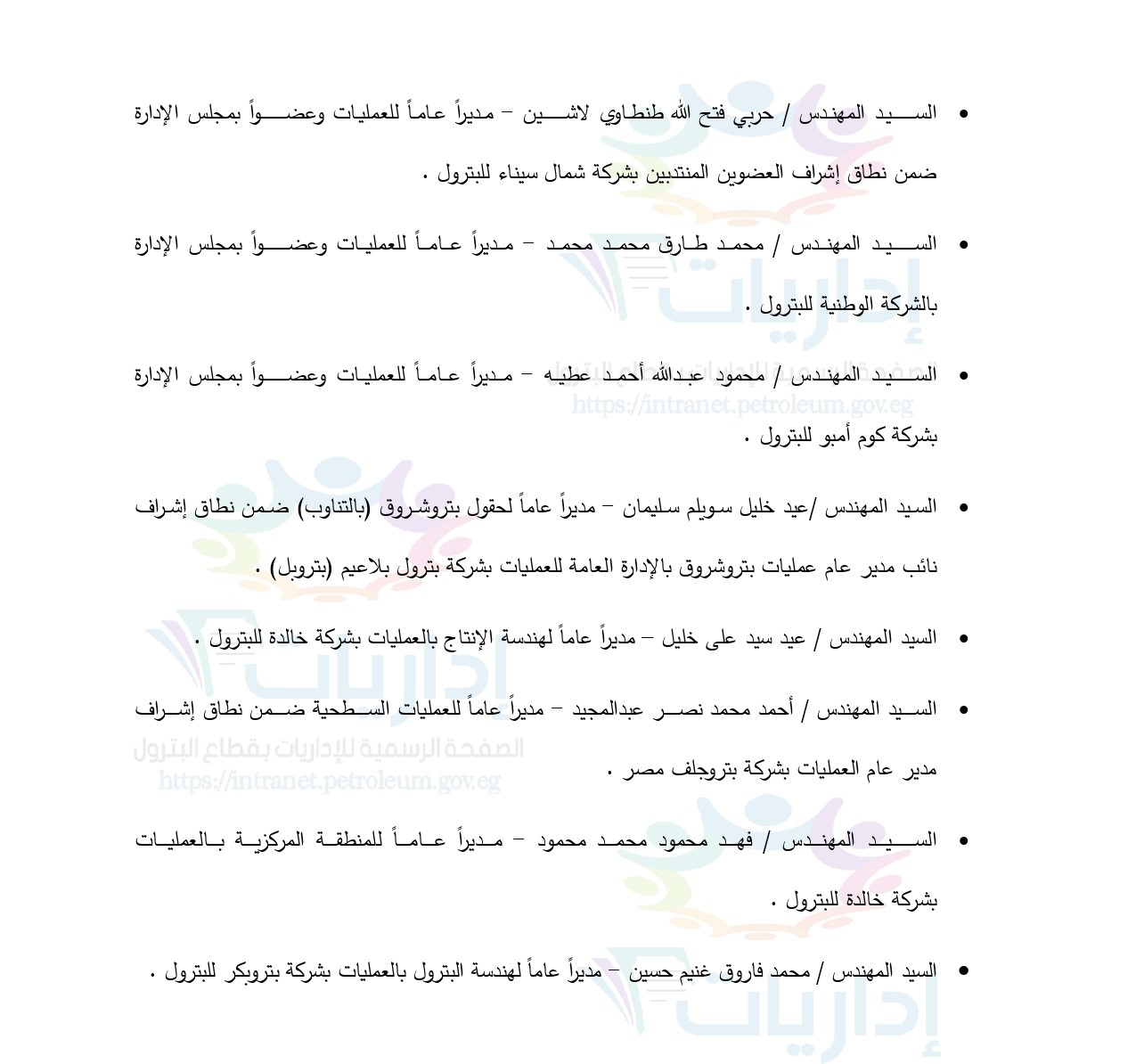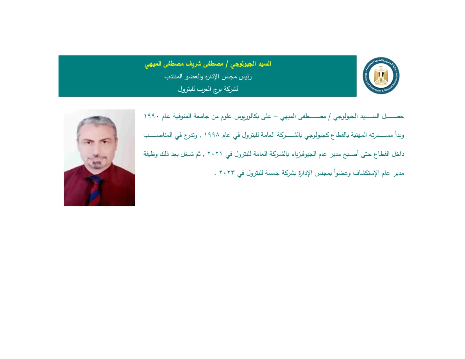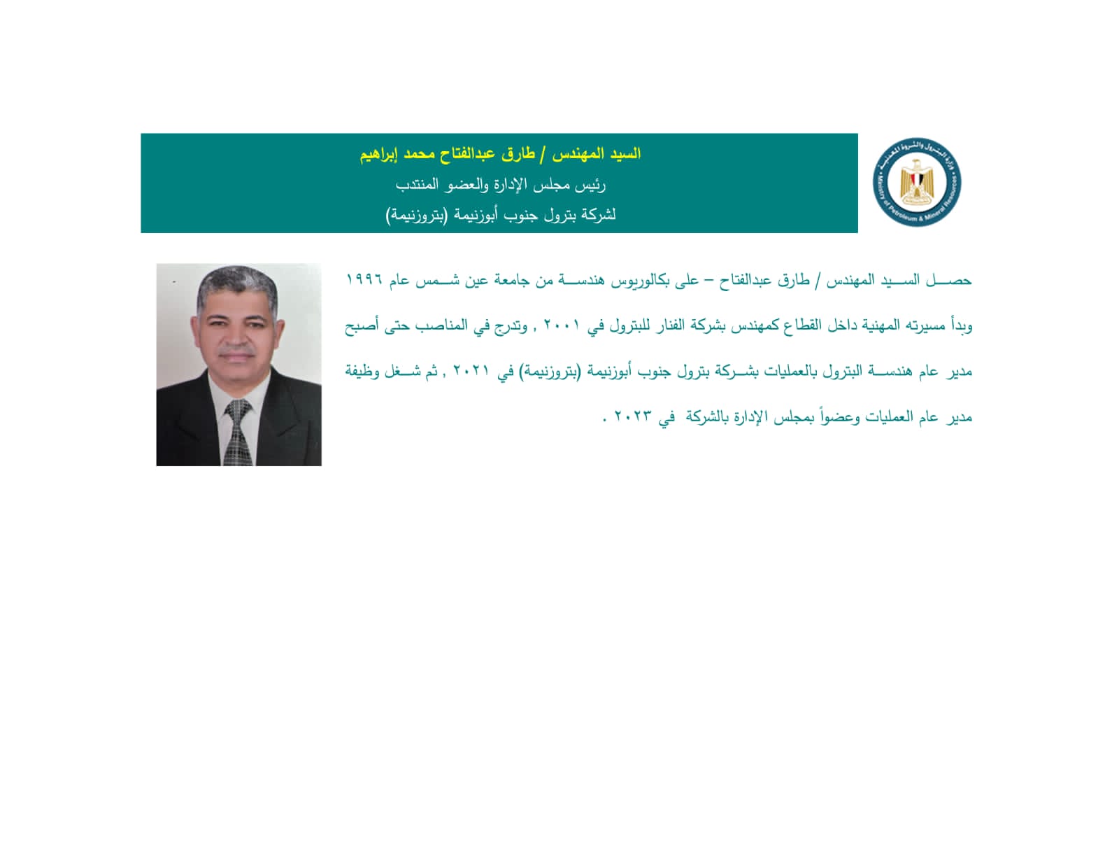 كما تم تكليف الجيولوجي مصطفى شريف الميهي بإدارة شركة برج العرب للبترول، وتعيين المهندس طارق عبد الفتاح محمد رئيسًا لمجلس إدارة "بتروزنيمة"، اعتبارًا من 15 أغسطس 2025.