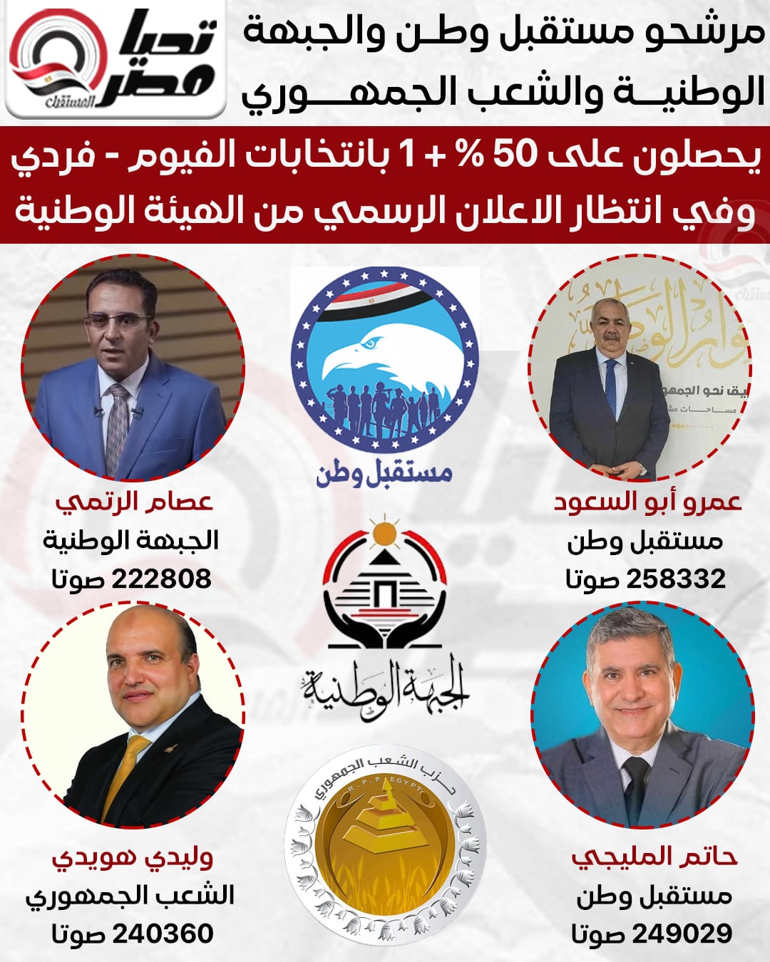 مرشحو مستقبل وطن والجبهة الوطنية والشعب الجمهوري يحسمون انتخابات الفردي بالفيوم.. في انتظار إعلان "الوطنية للانتخابات"
