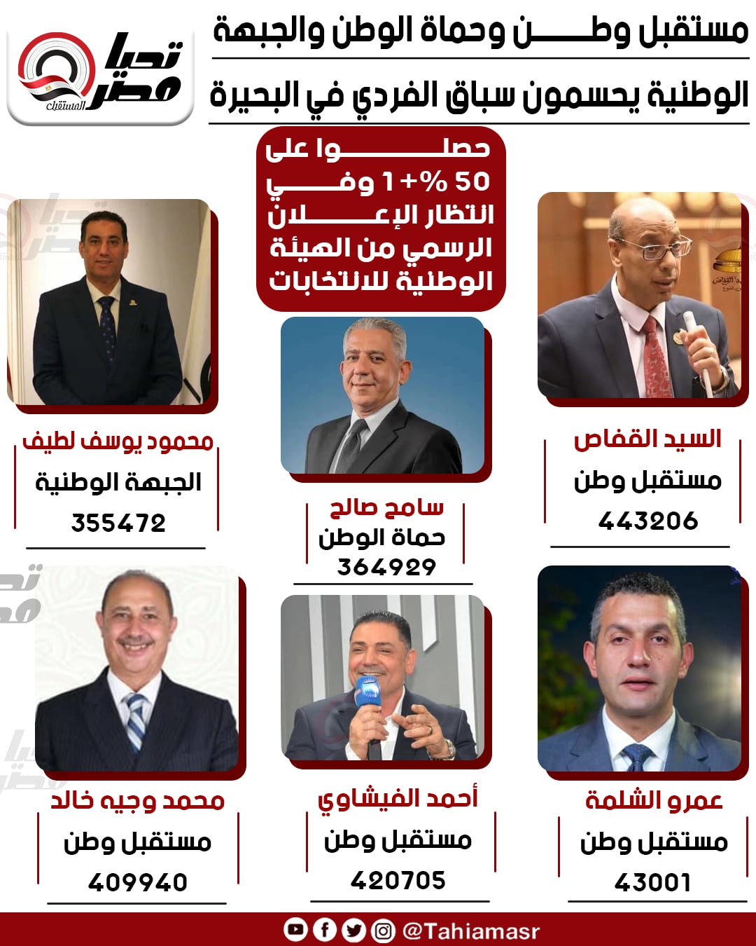 أسفرت النتائج الأولية غير الرسمية لفرز أصوات الناخبين في انتخابات مجلس الشيوخ 2025 بمحافظة البحيرة عن حسم مرشحي أحزاب مستقبل وطن وحماة الوطن والجبهة الوطنية لمقاعد النظام الفردي بعد حصولهم على نسبة تتجاوز 50%+1 من إجمالي الأصوات الصحيحة، وذلك في انتظار الإعلان الرسمي من الهيئة الوطنية للانتخابات.