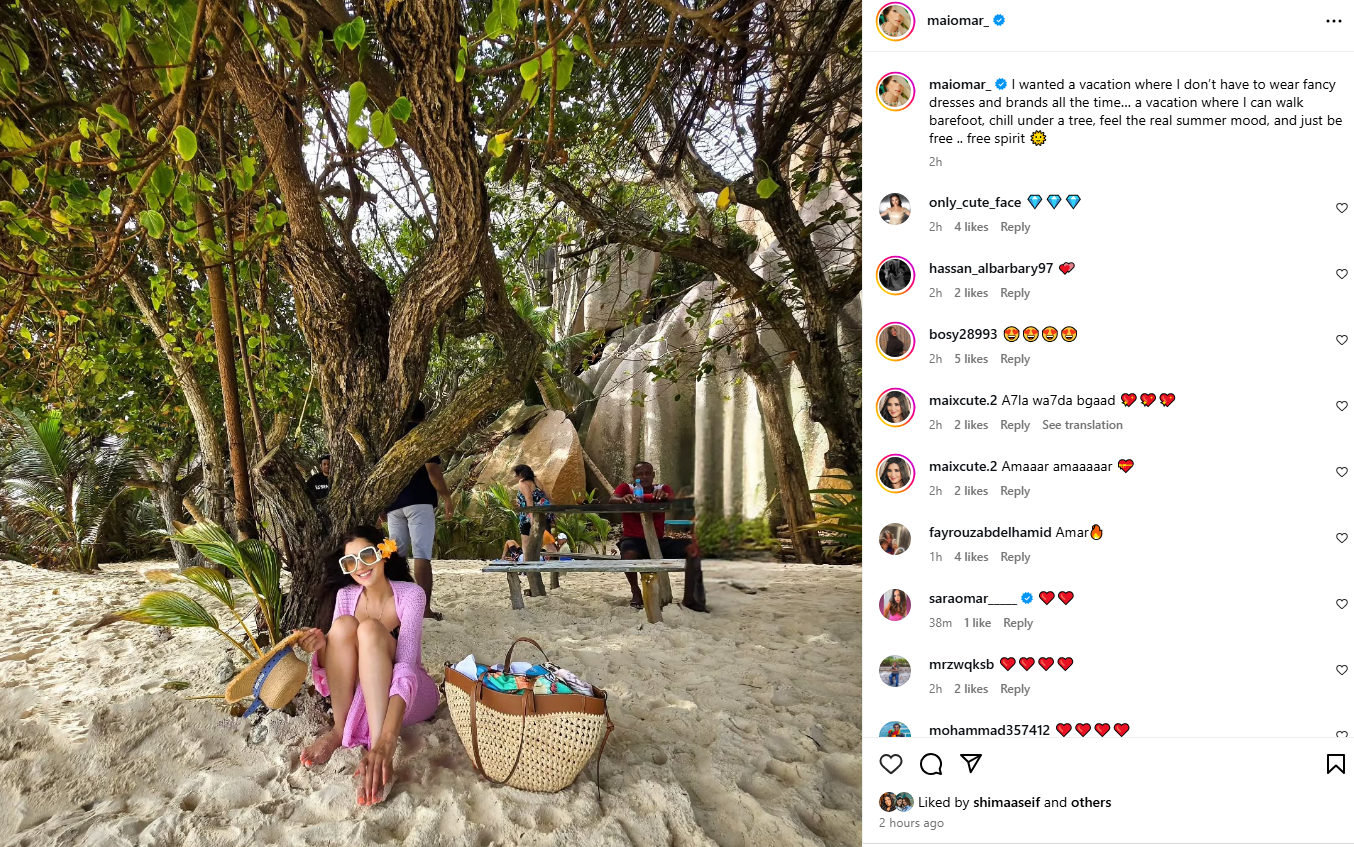 ونشرت مي عمر، صورها عبر صفحتها الرسمية على موقع التواصل الاجتماعي «إنستجرام» ورصدها موقع تحيا مصر، وعلقت عليها: «كنت أريد إجازة حيث لا أضطر إلى ارتداء فساتين فخمة وماركات طوال الوقت، إجازة حيث يمكنني المشي حافية القدمين، والاسترخاء تحت شجرة، والشعور بمزاج الصيف الحقيقي، وأن أكون حرة، روح حرة».