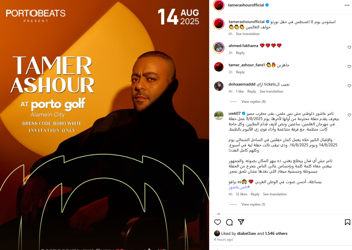 وشارك تامر عاشور بوستر الحفل وفقا لما رصده موقع تحيا مصر عبر صفحته الرسمية على موقع التواصل الاجتماعي إنستجرام وعلق عليه: "استنوني يوم ١٤ اغسطس في حفل بورتو جولف العلمين".