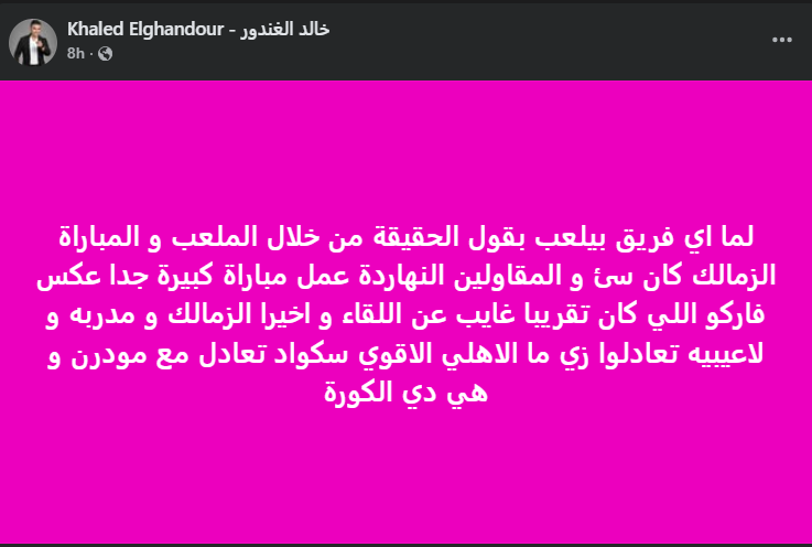 تحيا مصر، وكتب خالد الغندور عبر حسابه الرسمي"فيس بوك:" لما أي فريق بيلعب بقول الحقيقة من خلال الملعب، والمباراة الزمالك كان سئ ، والمقاولون عمل مباراة كبيرة جداً عكس فاركو اللي كان تقريبا غايب عن اللقاء، و اخيراً الزمالك و مدربه و لاعيبيه تعادلوا زي ما الاهلي الاقوي سكواد تعادل مع مودرن و هي دي الكورة".