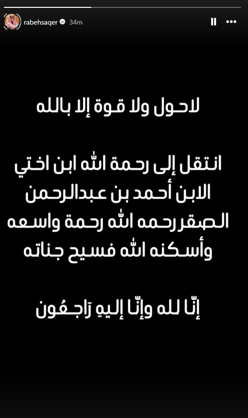 أعلن الفنان السعودي رابح صقر، عن وفاة نجل شقيقته، وذلك دون الكشف عن اي أسباب للوفاة، في خبر أحزن جمهوره ومحبيه، عبر موقع الفيديوهات والصور إنستجرام.