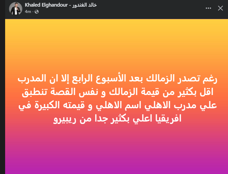 تحيا مصر، وكتب خالد الغندور عبر حسابه الرسمي"فيس بوك": رغم تصدر الزمالك بعد الأسبوع الرابع إلا أن المدرب أقل بكثير من قيمة الزمالك، و نفس القصة تنطبق علي مدرب الأهلي اسم الاهلي و قيمته الكبيرة في افريقيا أعلى بكثير جداَ من ريبيرو".