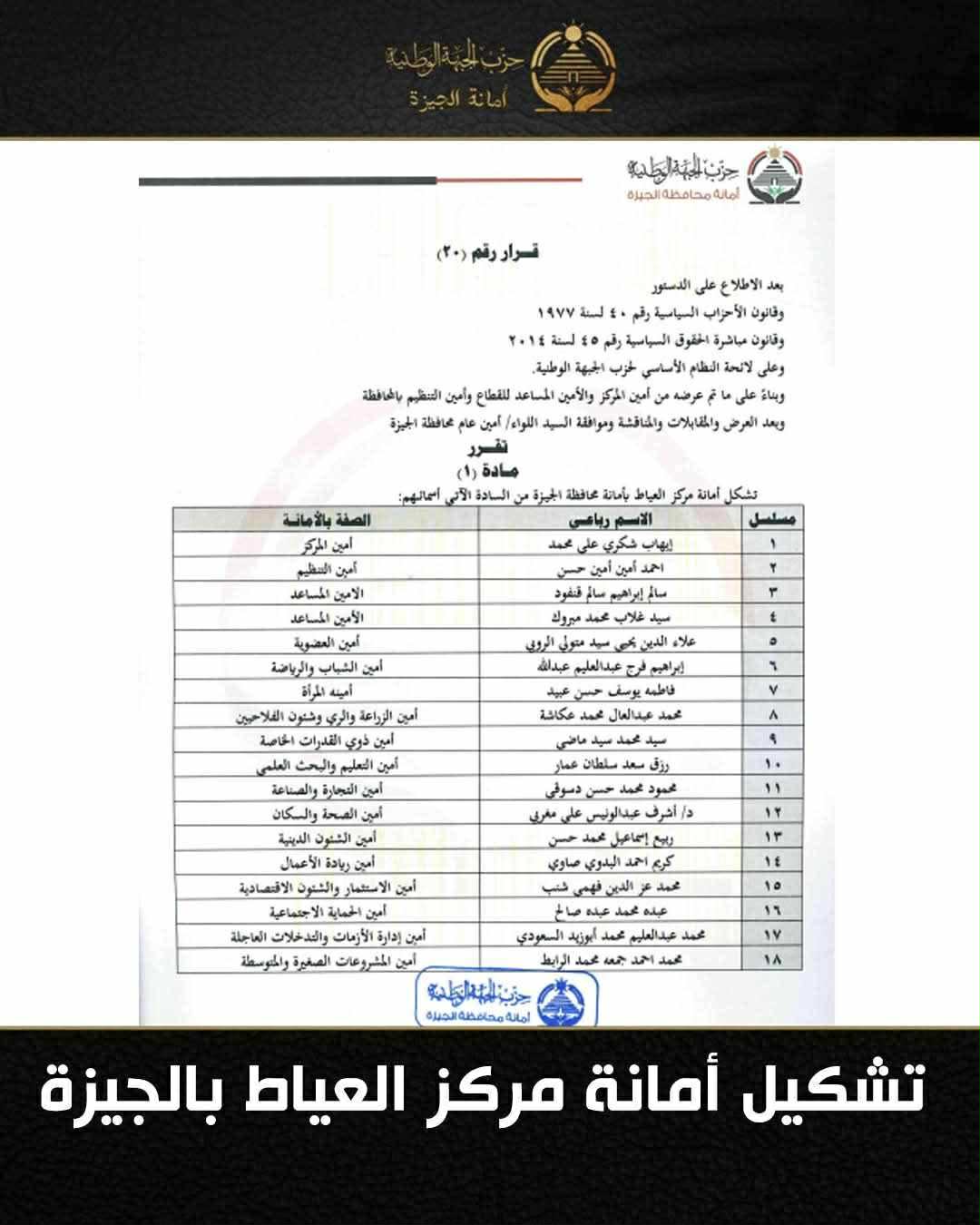 كما أصدر الحزب قرارًا مكملًا أمناء وأعضاء هيئة مكتب إضافيين لتعزيز العمل الحزبي بالمركز، حيث تم اختيار: