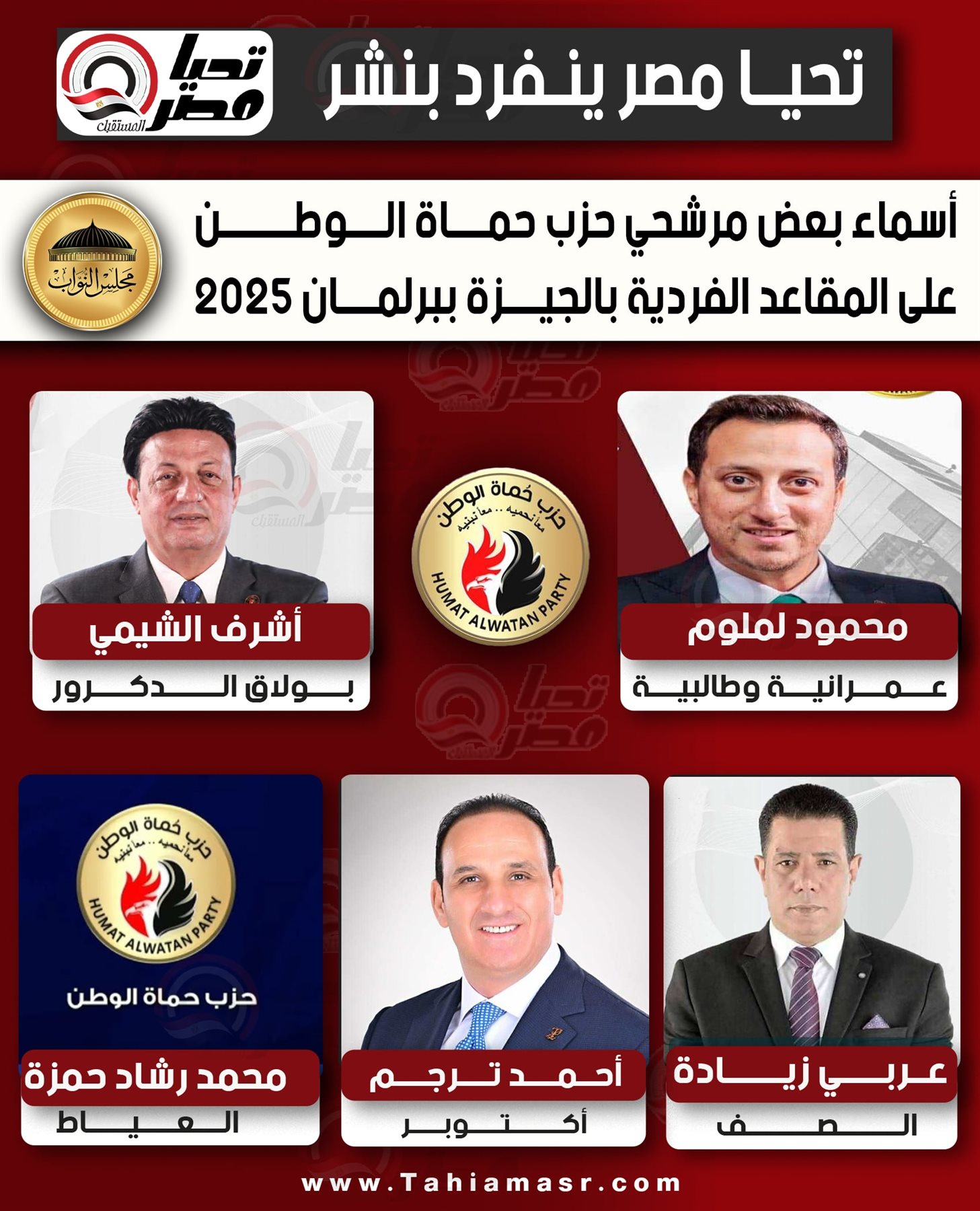ينفرد موقع تحيا مصر بالكشف عن أسماء عدد من مرشحي حزب حماة الوطن على المقاعد الفردية بمحافظة الجيزة في انتخابات مجلس النواب 2025.