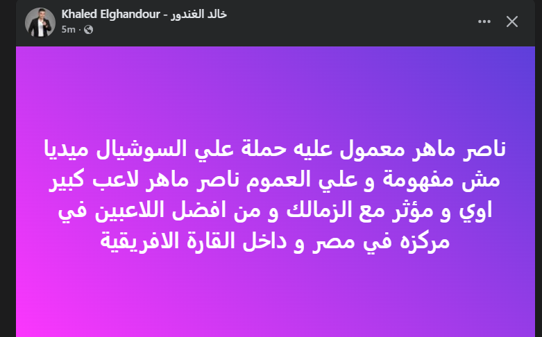 تحيا مصر، وكتب خالد الغندور عبر حسابه الرسمي"فيس بوك": ناصر ماهر معمول عليه حملة علي السوشيال ميديا مش مفهومة، و علي العموم ناصر ماهر لاعب كبير أوي، و مؤثر مع الزمالك و من أفضل اللاعبين في مركزه في مصر و داخل القارة الافريقية".