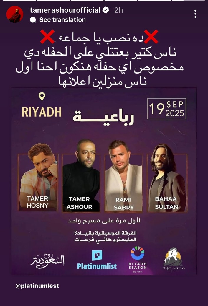 تامر عاشور ينفي مشاركته في "حفل الرباعيات": ده نصب.. وأي حفل بنعلنه بأنفسنا