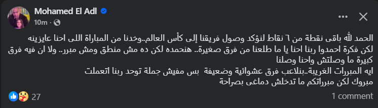 تحيا مصر، وكتب محمد العدل عبر حسابه الرسمي"فيس بوك": الحمد لله باقى نقطة من ٦ نقاط لنؤكد، وصول فريقنا إلى كأس العالم، وخدنا من المباراة اللى احنا عايزينه".