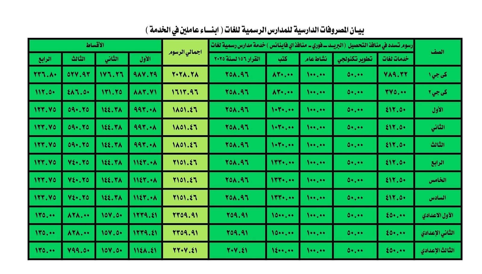 وتشمل رسوم المدارس الرسمية للغات (التجريبية) خدمات اللغات والتطوير التكنولوجي والنشاط وشراء الكتب إجباريا مع امكانية تقسيط المصروفات وممنوع سداد أي رسوم في المدرسة.