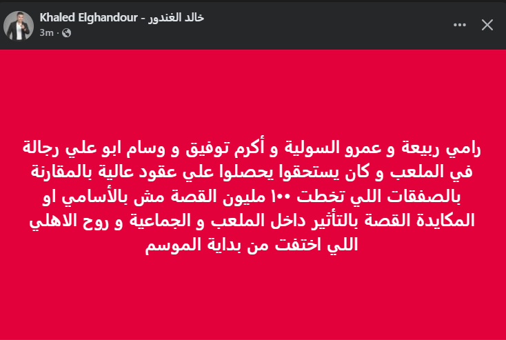 تحيا مصر، وكتب خالد الغندور عبر حسابه الرسمي"فيس بوك": رامي ربيعة و عمرو السولية، و أكرم توفيق و وسام أبو علي رجالة في الملعب، وكان يستحقوا يحصلوا علي عقود عالية بالمقارنة بالصفقات اللي تخطت ١٠٠ مليون القصة مش بالأسامي، أو المكايدة القصة بالتأثير داخل الملعب و الجماعية و روح الاهلي اللي اختفت من بداية الموسم".