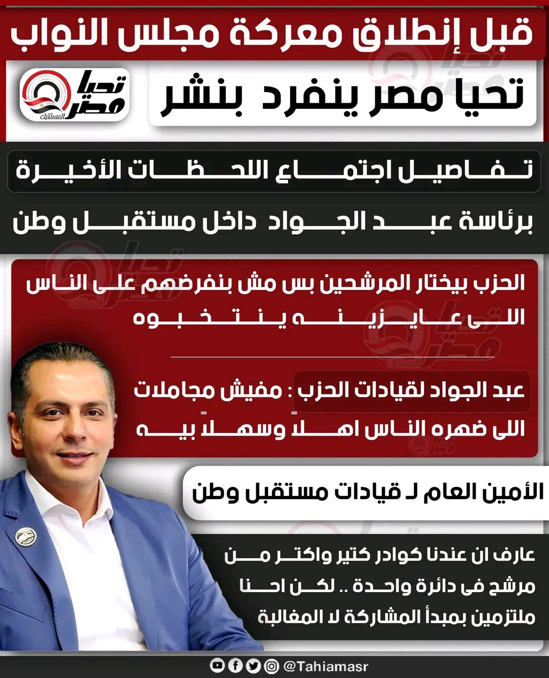 حصل “تحيا مصر” على تفاصيل اجتماع اللحظات الأخيرة الذي عقد برئاسة النائب عبد الجواد الأمين العام المساعد بحزب “مستقبل وطن”، لبحث ترتيبات الدفع بالمرشحين استعدادًا للاستحقاق النيابي المرتقب.