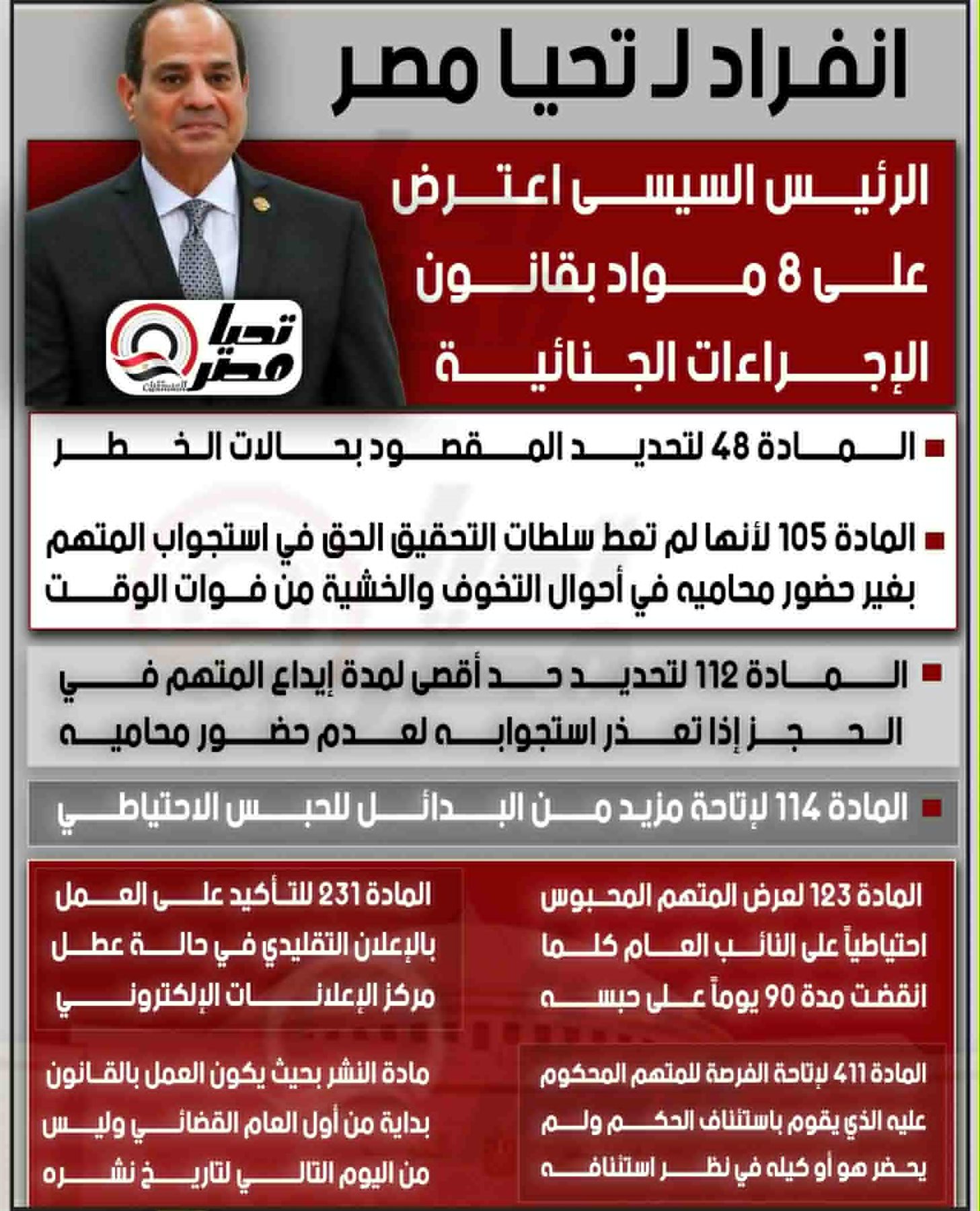 انفراد| تحيا مصر ينشر تفاصيل 8 مواد اعترض عليها الرئيس السيسي بمشروع قانون الإجراءات الجنائية الجديد