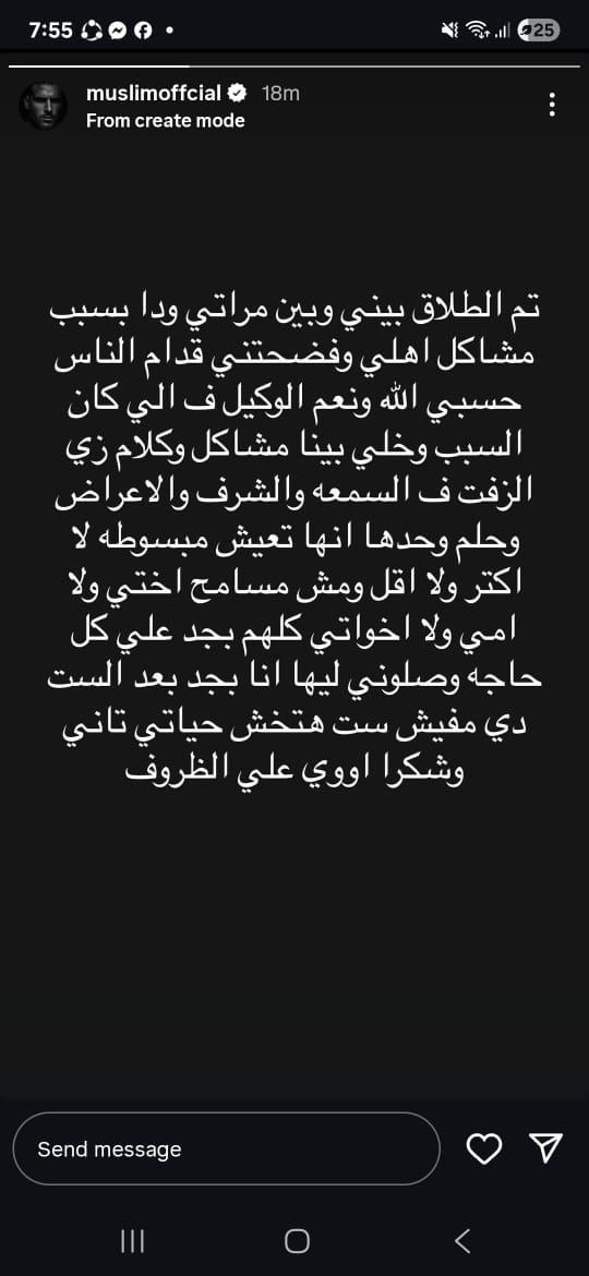 وكتب مسلم في منشور رصده موقع تحيا مصر على حسابه الرسمي بموقع تبادل الصور والفيديوهات انستجرام: تم الطلاق بيني وبين مراتي ودا بسبب مشاكل اهلي وفضحتني قدام الناس حسبي الله ونعم الوكيل ف الي كان السبب وخلي بينا مشاكل وكلام زي الزفت ف السمعه والشرف والاعراض وحلم وحدها انها تعيش مبسوطه لا اكثر ولا اقل ومش مسامح اختي ولا امي ولا اخواتي كلهم بجد علي كل حاجه وصلوني ليها انا بجد بعد الست دي مفيش ست هتخش حياتي تاني وشكرا اووي علي الظروف.