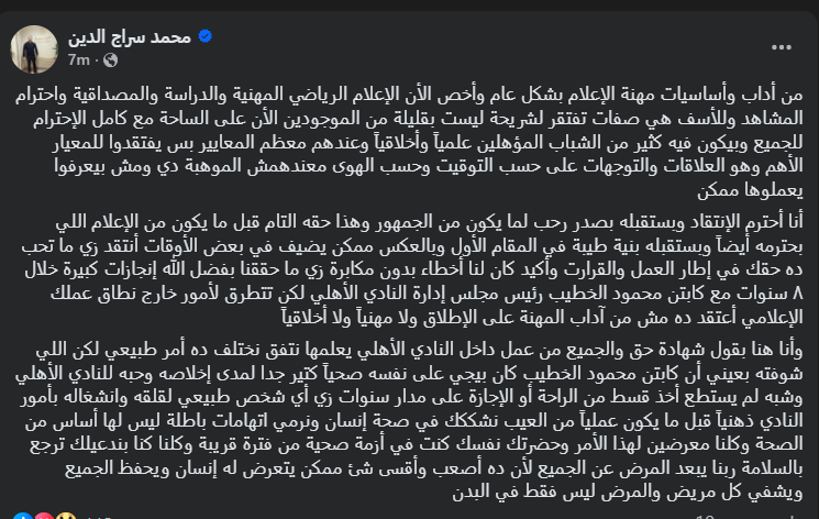 تحيا مصر، وكتب محمد سراج الدين عبر حسابه الرسمي"فيس بوك": من وأساسيات مهنة الإعلام بشكل عام وأخص الأن الإعلام الرياضي المهنية والدراسة والمصداقية، واحترام المشاهد وللأسف هي صفات تفتقر لشريحة ليست بقليلة من الموجودين الأن على الساحة مع كامل الإحترام للجميع، وبيكون فيه كثير من الشباب المؤهلين علمياً وأخلاقياً، وعندهم معظم المعايير بس يفتقدوا للمعيار الأهم وهو العلاقات والتوجهات على حسب التوقيت وحسب الهوى معندهمش الموهبة دي ومش بيعرفوا يعملوها ممكن".