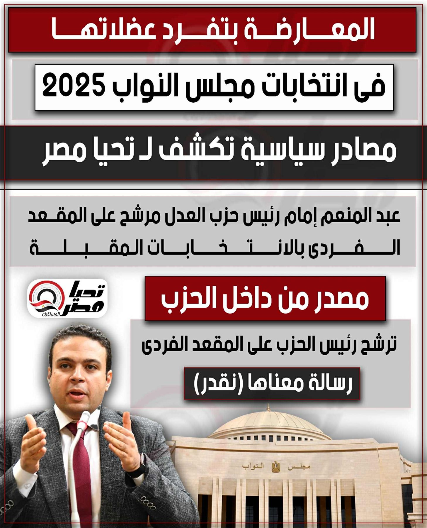 تجدر الإشارة إلى أن حزب العدل قد خاض انتخابات مجلس الشيوخ 2025 على عدد من المقاعد الفردية، فيما حصد 4 مقاعد من خلال القائمة الوطنية من أجل مصر.