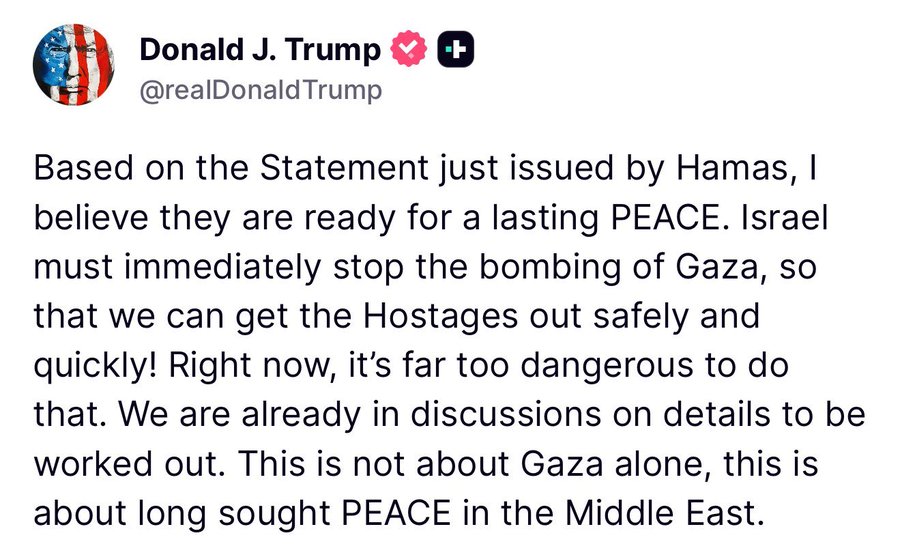 في أول تعليق رسمي من الرئيس الأمريكي دونالد ترامب، بعد إعلان حركة حماس الموافقة على خطة وقف الحرب في غزة، طلب من إسرائيل وقف فوري لقصف غزة حتى يتم الإفراج عن الرهائن وإخراجهم بأمان.