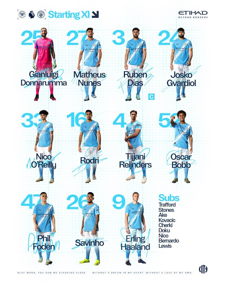 التشكيل الرسمي لمباراة مانشستر سيتي وبرينتفورد في الدوري الإنجليزي الممتاز