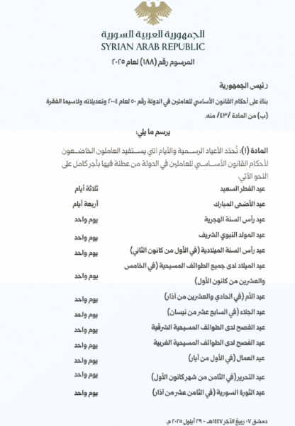 أفادت وكالة سانا السورية، اليوم الأحد، أن رئيس سوريا أحمد الشرع، إصدر مرسوماً يحدد فيه العطلات والإجازات الرسمية في البلاد وإلغاء عطلات كانت معمول بها لسنوات عديدة.