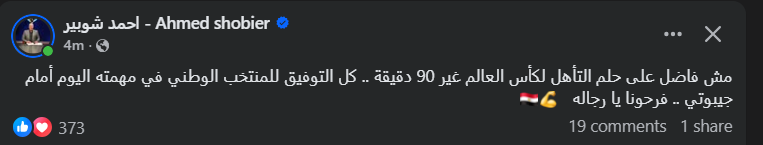 تحيا مصر، وكتب أحمد شوبير عبر حسابه الرسمي"فيس بوك": مش فاضل على حلم التأهل لكأس العالم غير 90 دقيقة .. كل التوفيق للمنتخب الوطني في مهمته اليوم أمام جيبوتي .. فرحونا يا رجالة".